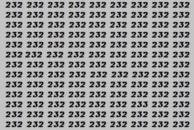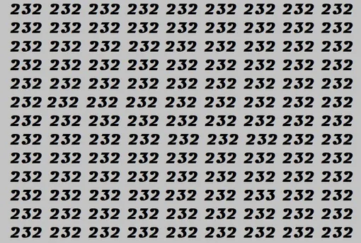 Перед вами серый фон, заполненный одинаковыми числами 232. Но среди них спряталось одно-единственное 233.