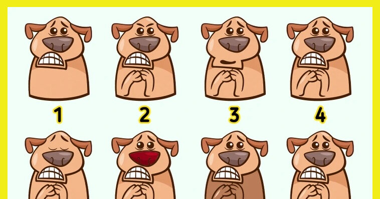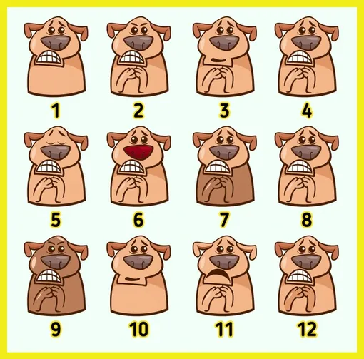 А теперь к самой задаче. На картинке изображены 12 мультяшных собак с забавным выражением мордочек – они выглядят то ли смущенными, то ли растерянными. На первый взгляд все псы одинаковые, но это ловушка: они отличаются оттенками, формой глаз, положением бровей и мелкими деталями. Однако среди них спрятались две абсолютно одинаковые собаки.