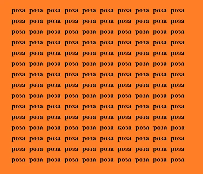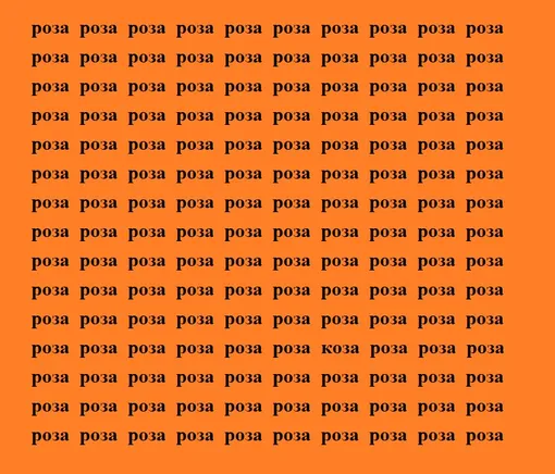 А теперь к делу. Перед вами картинка с множеством одинаковых слов «роза» на оранжевом фоне. Но одно слово все же отличается – это «коза».