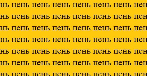 Перед вами желтая картинка, заполненная множеством одинаковых слов «пень». Они выстроились плотными рядами и выглядят почти неразличимо.
