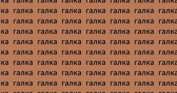 А теперь к самой задаче. На коричневой картинке размещено множество одинаковых слов «галка». Но среди них притаилось одно-единственное слово – «палка». Оно почти сливается с остальными и маскируется за счет схожего написания.