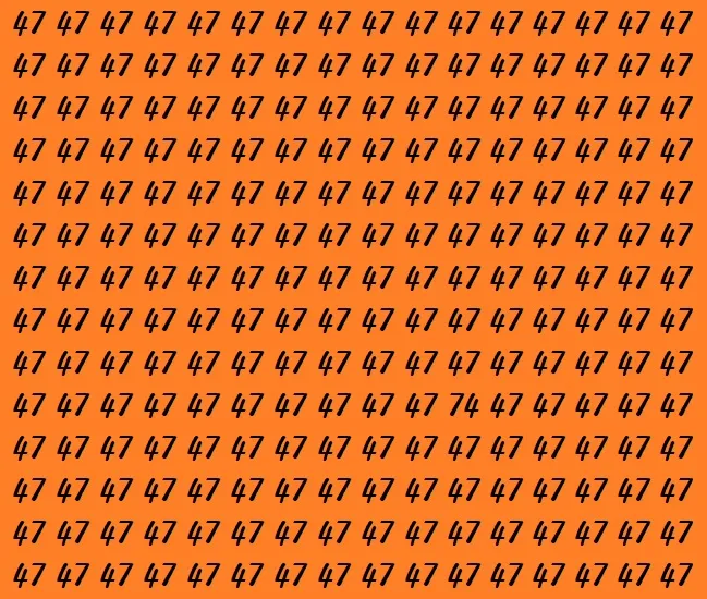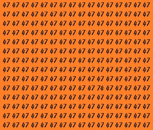 Перед вами оранжевый фон, заполненный множеством одинаковых чисел 47. Однако среди них скрывается одно единственное число 74. Засеките 8 секунд и начинайте поиск – внимательно сканируйте изображение строка за строкой.