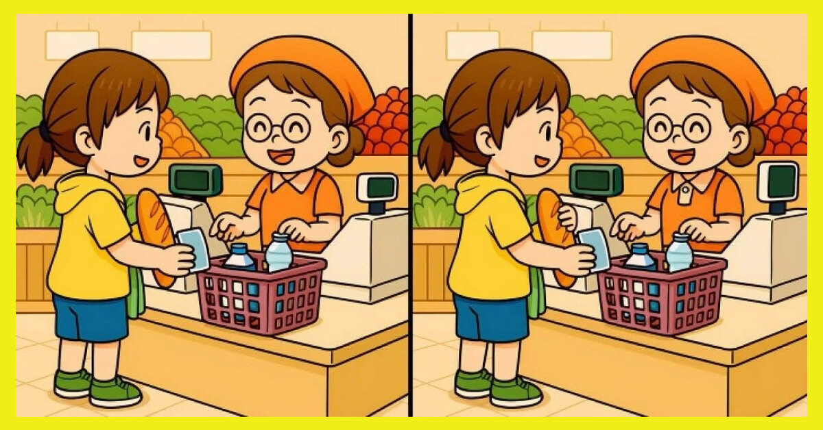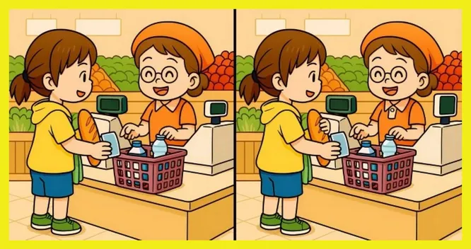 Перед вами два почти идентичных рисунка: девушка стоит у кассы с корзиной товаров и мило общается с кассиршей. На первый взгляд все совпадает, но три отличия все же есть – и они прячутся в деталях сцены. Засеките 25 секунд и начинайте поиск!