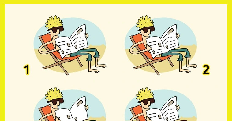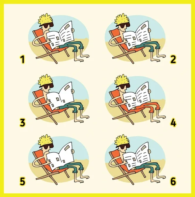 На картинке изображены шесть светловолосых мужчин в темных очках, которые сидят на шезлонгах и читают газеты. На первый взгляд они почти не отличаются, но если присмотреться, у каждого есть небольшие особенности: выражение лица, цвет штанов, детали газеты. И все же среди них спряталась одна абсолютно идентичная пара.