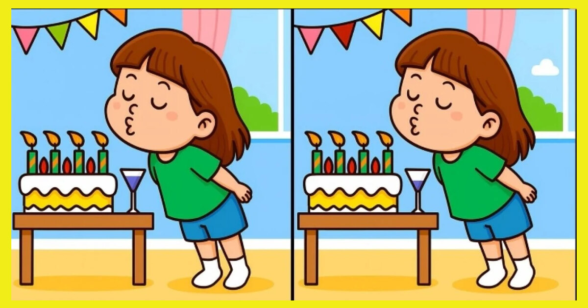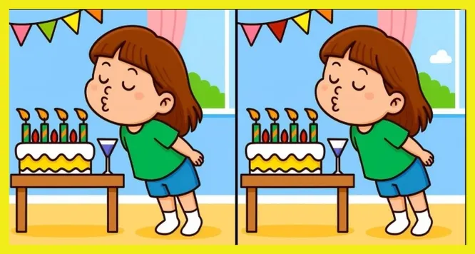 На двух рисунках изображена девочка, которая задувает свечи на праздничном торте. Картинки почти одинаковые, но между ними спрятаны три небольших отличия.