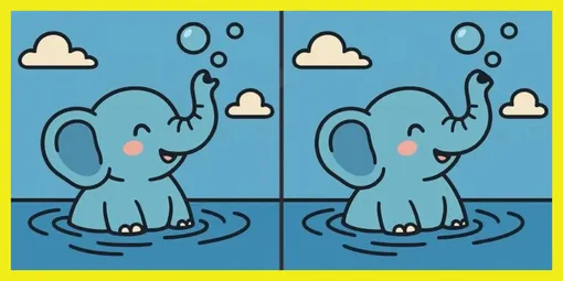 На двух рисунках изображен очаровательный слоненок, который купается под открытым небом и радостно пускает пузырьки из хобота. Картинки выглядят почти одинаково, но между ними спрятались три отличия.