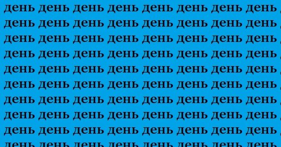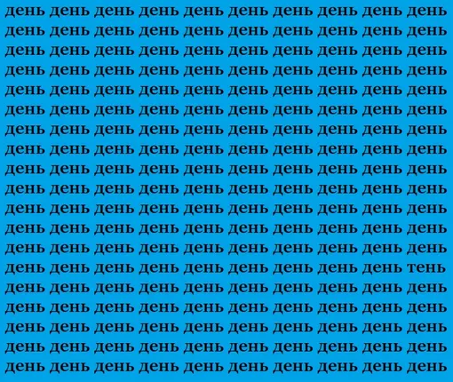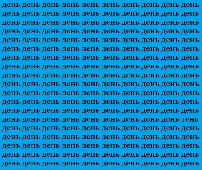 Перед вами яркая голубая картинка, заполненная многочисленными повторяющимися словами «день». Но где-то там спряталась хитрая «тень», замаскировавшись под остальные слова. Возьмите телефон или часы, засеките 17 секунд и начинайте поиски!