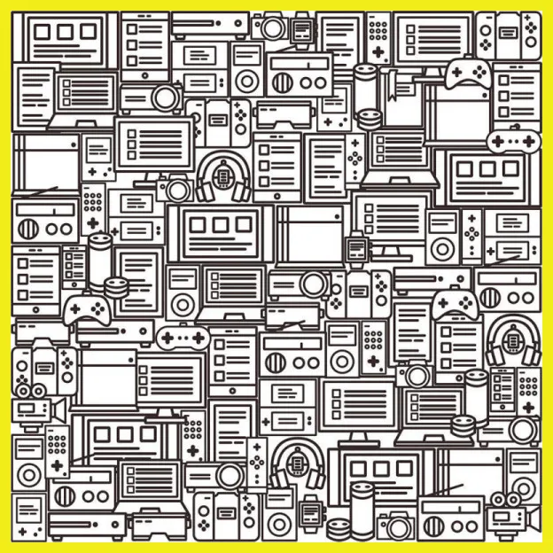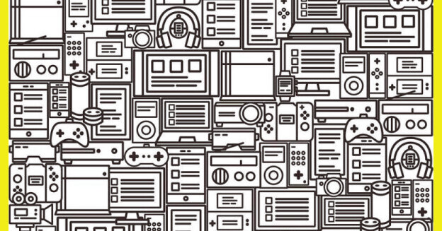 Перед вами черно-белая картинка, заполненная множеством гаджетов: здесь можно разглядеть радио, пульты, наушники, ноутбуки, геймпады. Все это сливается в единый узор, и именно поэтому среди них так непросто заметить одну-единственную книгу.