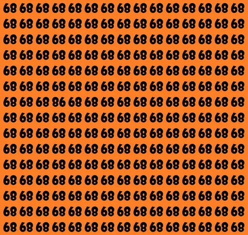 Перед вами яркая оранжевая картинка, заполненная одинаковыми числами 68. Но среди них спрятано одно-единственное число 86. Оно почти не отличается на первый взгляд, поэтому глаз легко «проскальзывает» мимо.