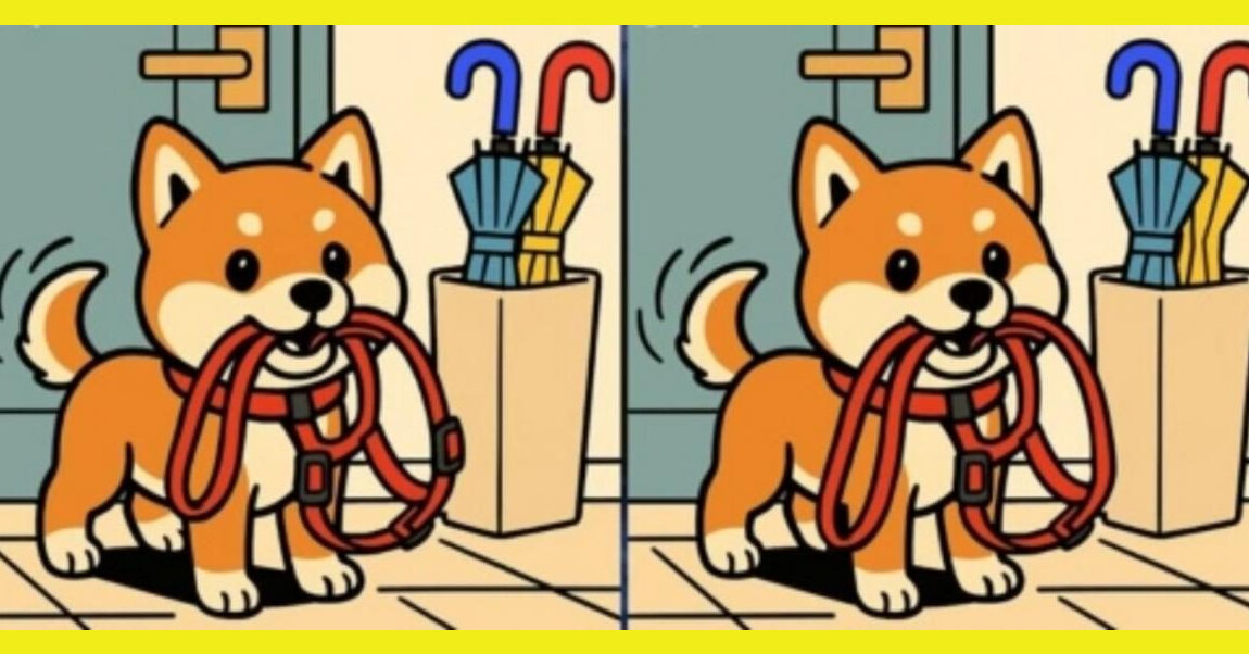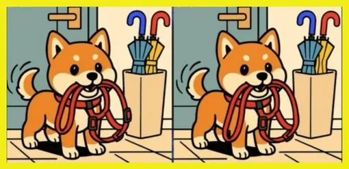 Перед вами две почти одинаковые сцены: милая собачка держит в зубах ярко-красный поводок, за спиной – дверь, рядом стоит корзина с двумя зонтиками. На первый взгляд все совпадает, но это иллюзия – различия спрятаны в деталях.
