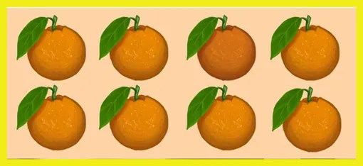 Перед вами изображение с восемью мандаринами с зелеными листиками. На первый взгляд – абсолютно одинаковые. Но один из них отличается.