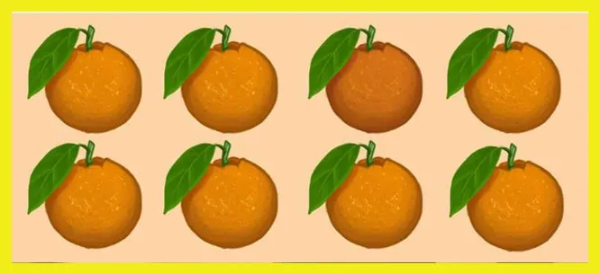 Не переживайте, если сначала ничего не видно – это нормально. Сфокусируйтесь, замедлите взгляд и внимательно осмотрите каждый фрукт. Важная подсказка: обратите внимание на оттенок мандарина.