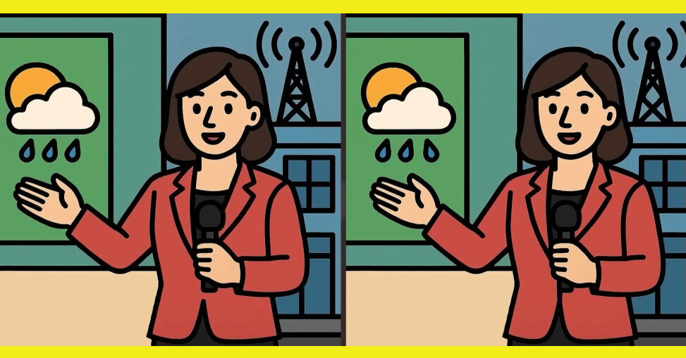 Перед вами два почти одинаковых изображения: ведущая прогноза погоды в красном пиджаке показывает на экран с облаком и дождем, в другой руке держит микрофон. На фоне – крыша здания и вышка. Но не все так просто – между картинками есть три отличия.