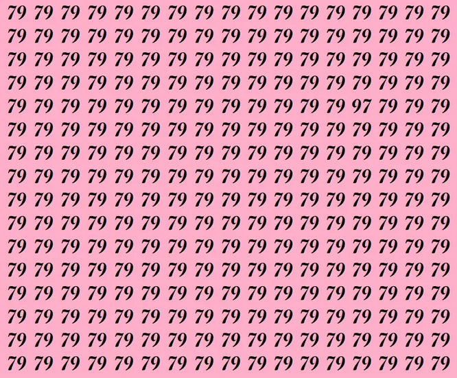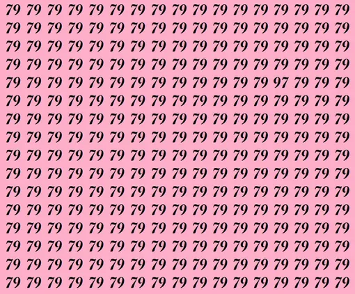 Чуть ниже представлено изображение: на розовом фоне расположено множество одинаковых чисел «79». Но среди них спрятано одно «97». Ваша задача – найти его всего за 10 секунд.
