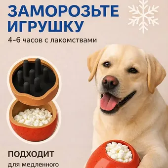 Это довольно старая игрушка, давно и хорошо себя зарекомендовавшая. Принцип действия – внутрь полого конуса из резины кладут влажный корм, паштет или пюре, а затем замораживают. В итоге у собаки уходит до часа времени, чтобы вылизать все содержимое. Это одновременно и успокаивает ее, и заставляет работать. Лучше всего игрушку применять в жару.