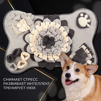Это не просто красивая игрушка – это коврик из множества лоскутков, в которые зарыт корм. Собаке нужно буквально зарыться в него носом и отыскать еду между складок. Нюхать и искать – базовый инстинкт, который быстро восполняет норму умственной нагрузки и успокаивает нервную систему.