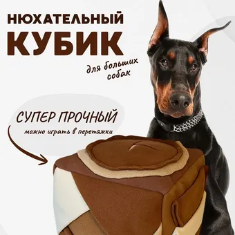 Другой вариант с добыванием еды – огромный куб. Здесь собаке нужно не просто катать предмет по полу, а толкать его, чтобы перевернуть и достать лакомство. Размер можно подобрать, исходя из роста вашей собаки. С такой игрушкой питомец не только работает умственно, но и физически: иногда необходимо приложить усилие, чтобы куб перевернулся как надо.