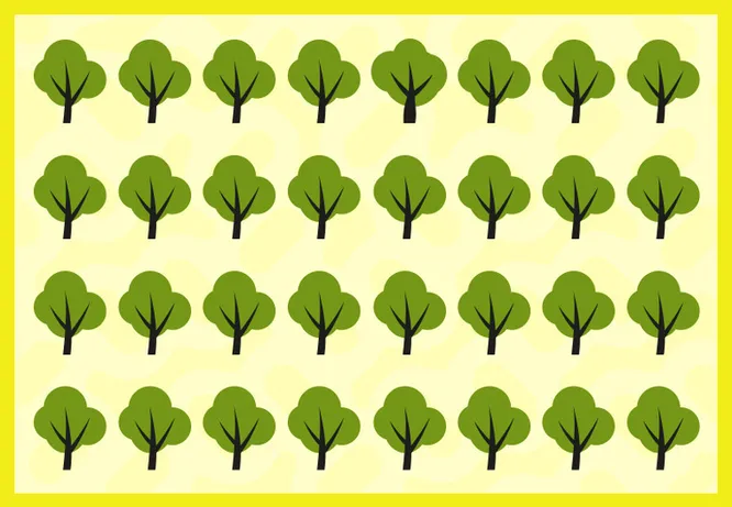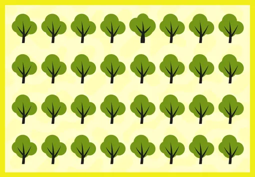 Ниже картинка: 32 минималистичных зеленых дерева, аккуратно выстроенные в четыре ряда. На первый взгляд – все одинаковые. Но среди них есть одно дерево, которое чуть-чуть отличается.