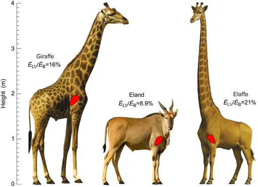 Дальнейшие расчеты показали, что обыкновенный жираф тратит 16% своей общей энергии на работу сердца, в то время как у элаффа этот показатель вырос до 21%. Это значит, что если бы у жирафа были короткие ноги, ему пришлось бы потреблять еще больше пищи — на 3000 килоджоулей (или более 700 ккал).