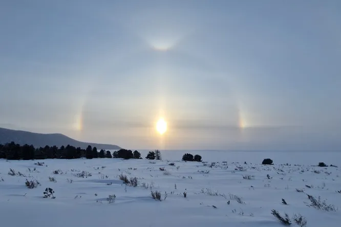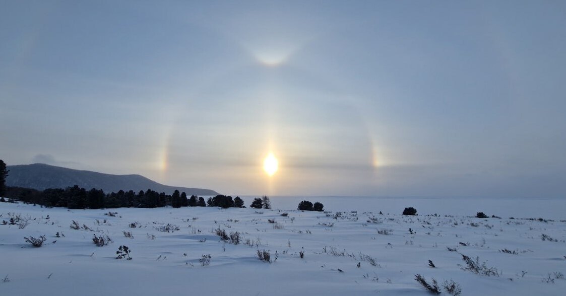В последние дни Бурятию накрыли сильные морозы: температура воздуха стабильно ниже -20℃, влажность воздуха относительно высокая, но при этом без осадков, небо чистое с ярким солнцем. Все эти условия стали причиной появления в небе редкого природного явления — образования гало, то есть светового полукруга вокруг солнечного диска.