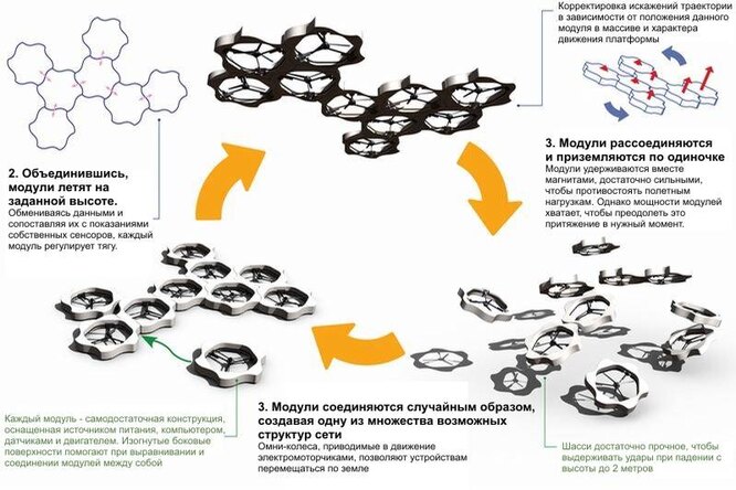 Отдельные модули могут передвигаться по земле на омни-колесах и объединяться со своими «собратьями». Могут они и летать по одиночке, но в таком случае полет получается неровным и трудно контролируемым — отдельный модуль довольно неустойчив в воздухе. Но комплексная платформа, состоящая из нескольких таких устройств, демонстрирует гораздо лучшие летные характеристики. Объединенные между собой модули быстро обмениваются информацией, необходимой для контроля полета платформы, и согласованно регулируют скорость вращения винтов.