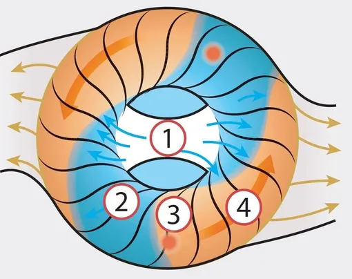 Когда канал достигает окна тракта высокого давления, начинается самое интересное: заряд холодного сжатого воздуха устремляется в цилиндры, а вдогонку за ним расширяется облако выхлопного газа. Но так как в этот момент окно закрывается, горячая волна, как мячик, отскакивает от торцевой крышки и пулей вылетает в подоспевший с другой стороны канала выпускной порт. Возникающая при этом мощная волна разрежения засасывает внутрь ротора избыточную порцию воздуха, часть которого продувает канал насквозь, охлаждая стенки. За один оборот ротора Comprex совершает два цикла сжатия-расширения.