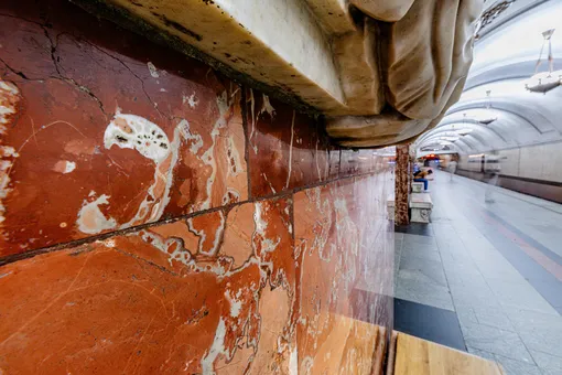 Все граненые колонны, выставленные в центре платформы станции, облицованы крымским мраморовидным известняком «биюк-янкой» желто-коричневых тонов, и на каждой из них можно разглядеть целый мир ископаемых коралловых построек мелового или юрского периода, привезенных из Крыма.