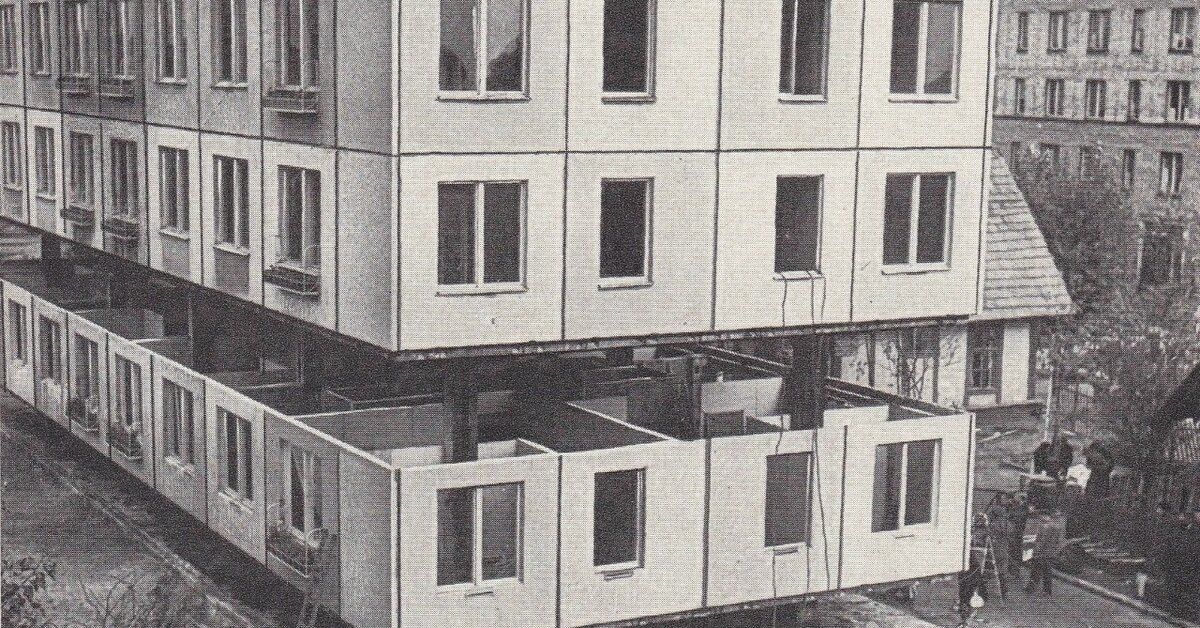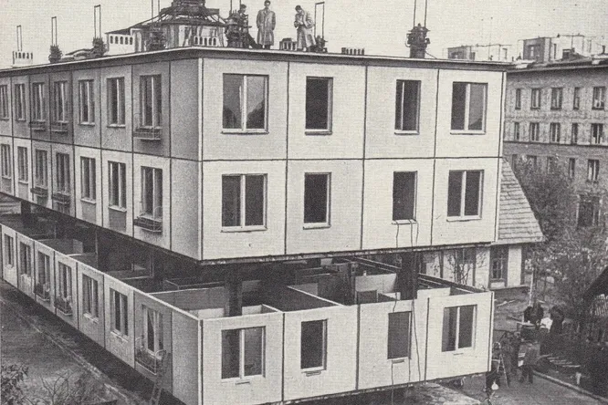 На то были две главные причины: дефицит строительных кранов и желание ускорить массовое жилищное строительство (да, срок в две недели, за который строили хрущевки, тогда вдруг показался невероятно долгим). Сборка блока на уровне земли — безопаснее и удобнее для рабочих, как подумали советские инженеры, а поднимать готовые секции вполне можно было гидравлическими домкратами, чтобы экономить время и технику.