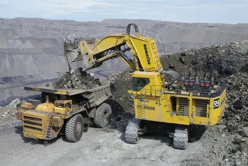 Предварительно разведанный и размеченный горными инженерами — марк-шейдерами- участок превращается в некое подобие дуршлага: мощные буровые станки забуривают в предназначенном к взрыву блоке породы десятки и сотни взрывных скважин, расположенных в строго определенном порядке. Взрывники при помощи специального «зарядного автомобиля» заполняют подготовленные скважины взрывчатым веществом, устанавливают и соединяют в единую цепь детонаторы, после чего устраивают маленькое землетрясение, в результате которого прочный скальный массив превращается в груду обломков. Затем в забой прибывают огромный экскаватор и бульдозеры. Бульдозеры зачищают площадку для работы экскаватора, а грейдеры формируют более-менее ровные дороги. Далее в дело вступают гигантские карьерные самосвалы Komatsu 930Е-4АТ и дизель-гидравлический экскаватор PC5500. Один за другим самосвалы подъезжают на место погрузки, принимают в свой кузовок привычные 290 т и отправляются для разгрузки на отвалы — рукотворные горы, непременный атрибут любого горнодобывающего предприятия.