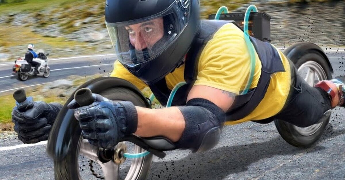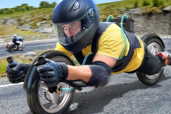 Результатом его творчества стал костюм-мотоцикл – экзоскелет на колесах, позволяющий буквально лечь на дорогу, крутануть ручку газа и ехать на скорости до 30 км/ч, пугая прохожих криками «берегись!» откуда-то из-под их ног.
